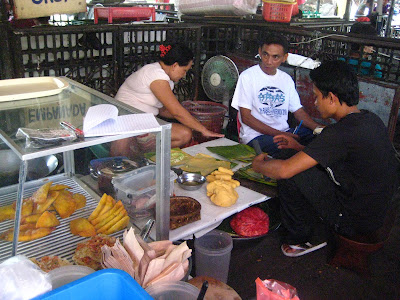 A pregnant missis slices luya, sili, kalamansi, sibuyas, kamatis inside the pedicab while her hubby cleans the fish (in this case, i think it's dilis) by the side of the wharf. In the meantime, a kaldero of rice is waiting for the ulam at the bottom of the pedicab.